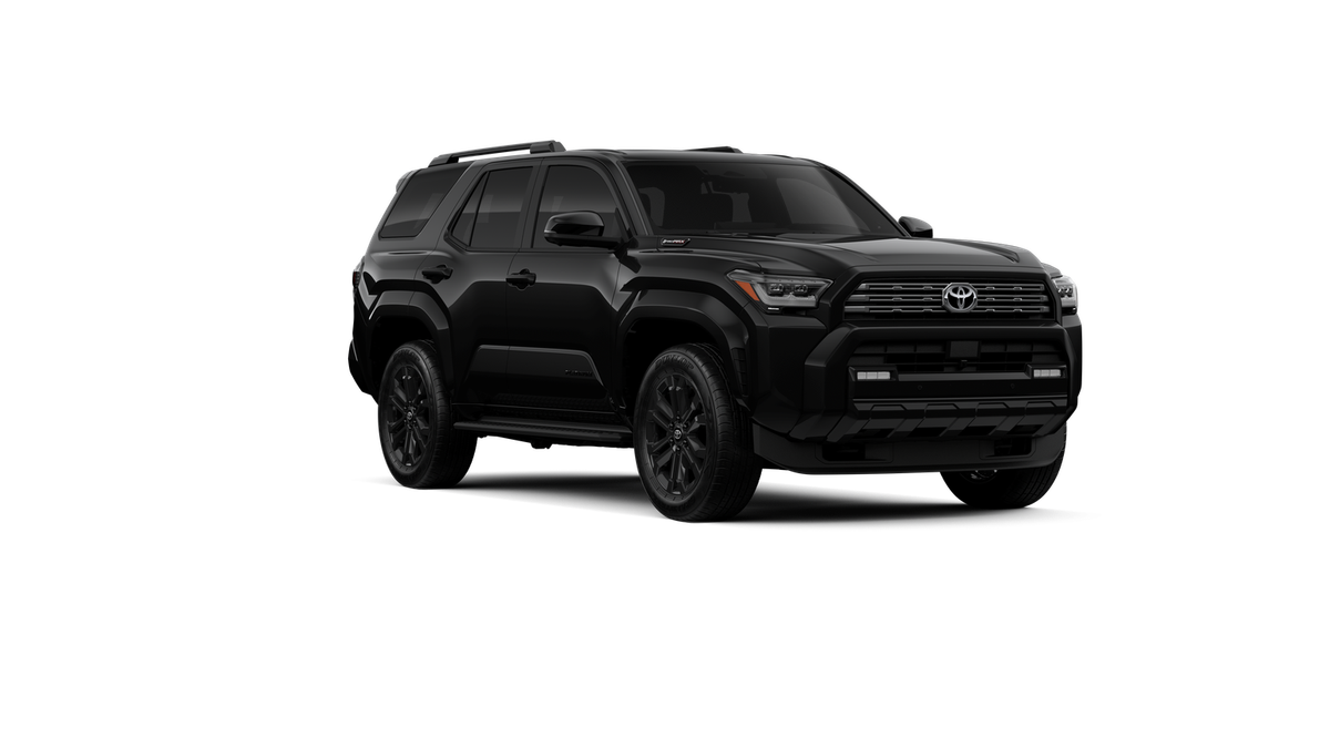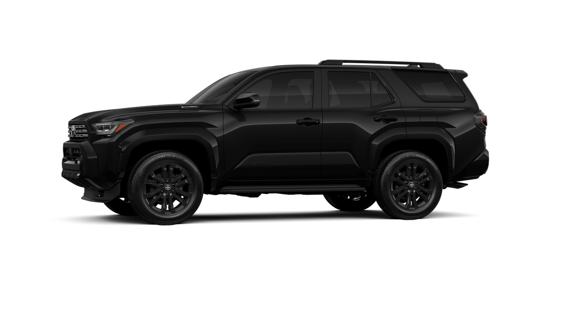 - Dark-chrome tri-bar grille; gloss-black mirror caps and door handles; color-keyed overfenders and rear spoiler; gloss-black "PLATINUM" and "4RUNNER" badges