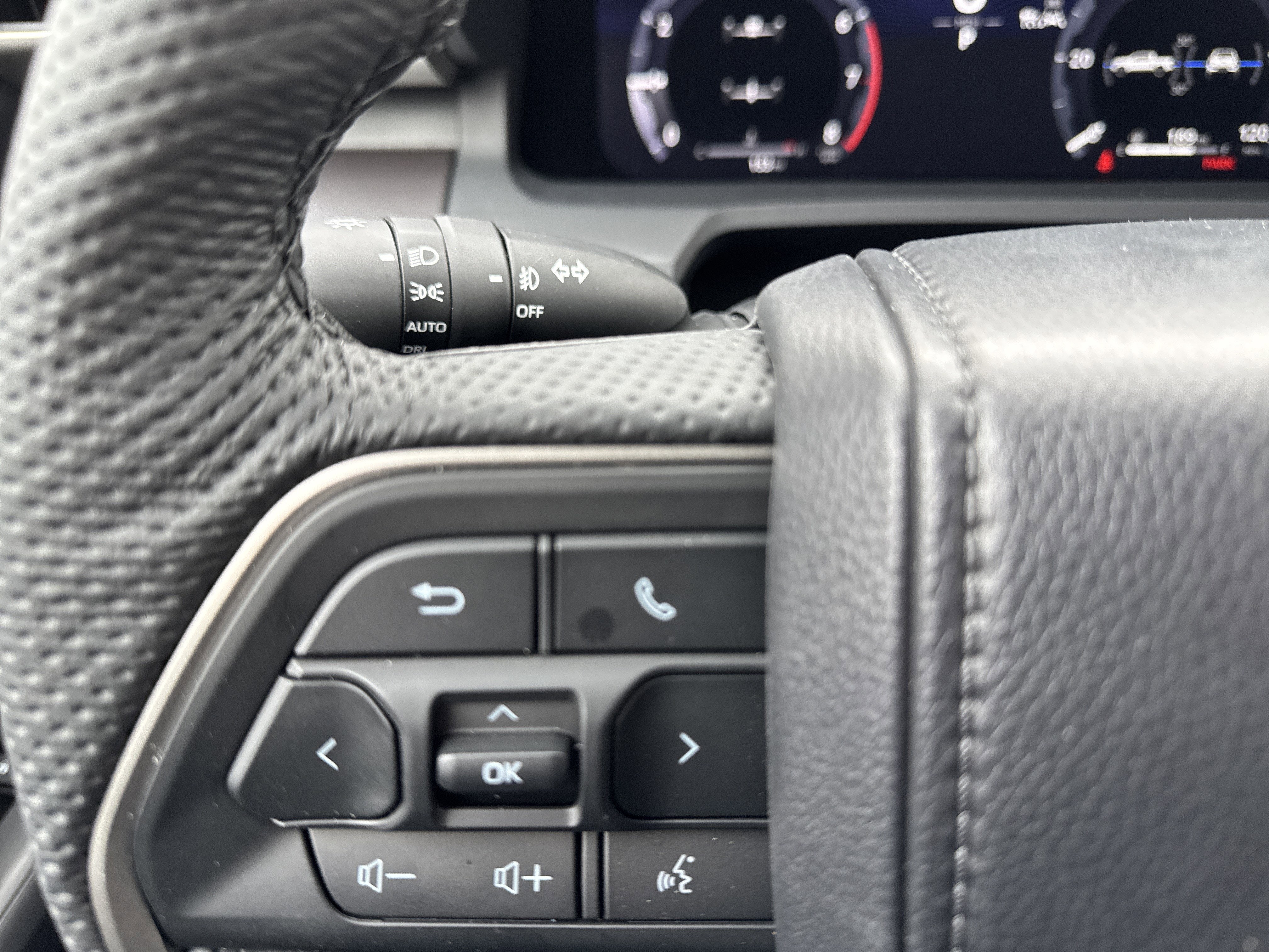 - Leather-trimmed manual tilt/telescopic steering wheel with phone, audio, display/infotainment, and Driver Assist controls