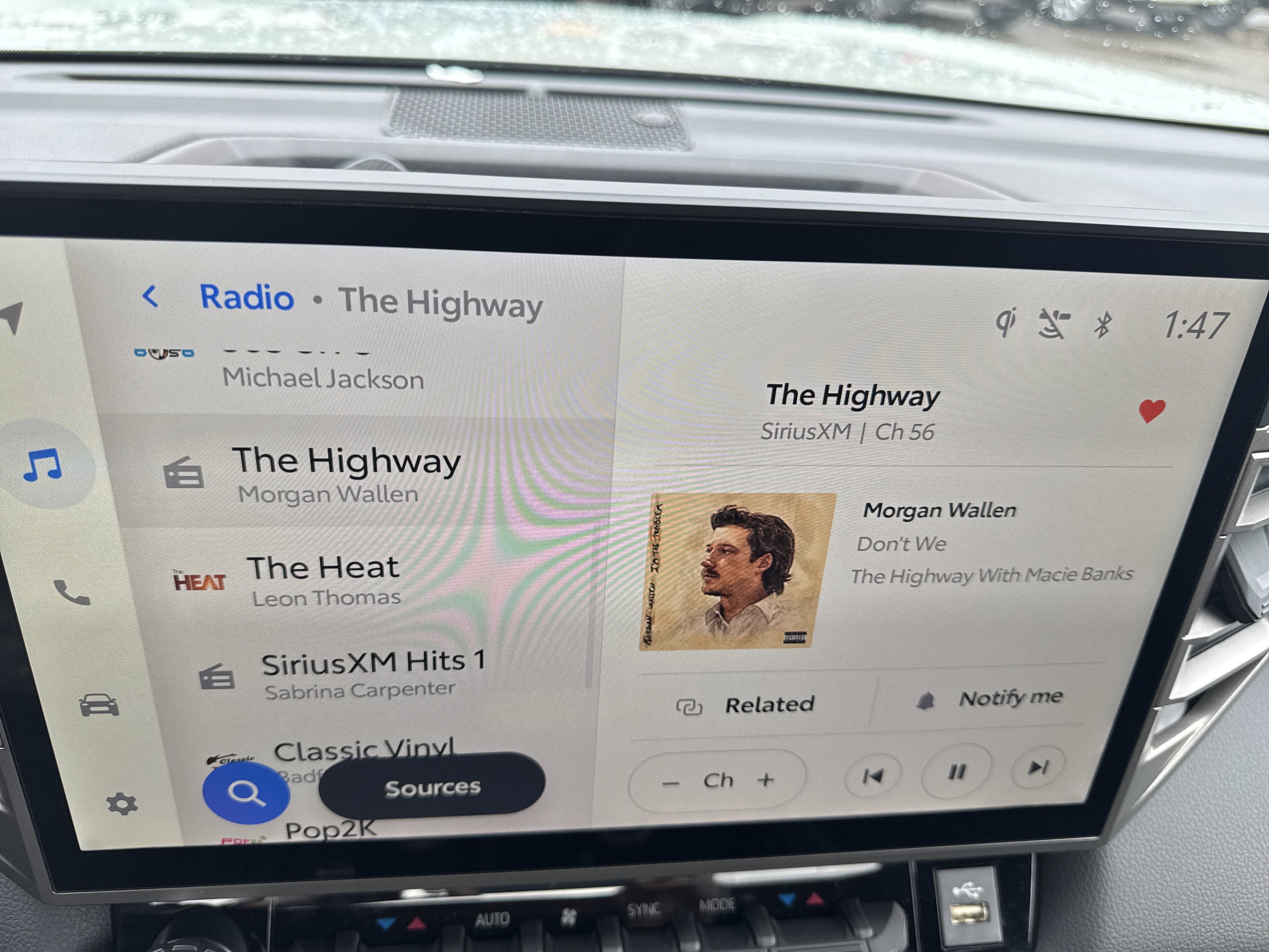 - Leather-wrapped manual tilt/telescopic steering wheel with phone, audio, display/infotainment, and Driver Assist controls